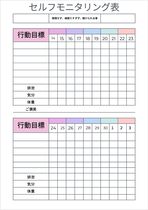 私がサポートさせていただいている方にはお渡ししているセルフモニタリング表はこんな感じです。
